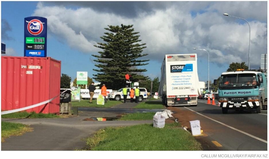 事故发生在中午12点10分,地点在Avondale区Rosebank Rd上的Gull加油站。Te Atatu消防站官员Geoff Gardner称,一辆卡车在行驶时,车厢内装载的变压器掉了出来,导致约200升矿物油洒在现场。他称,这辆卡车由于装载不当、未遵守安全方式,导致装载物掉落,进而引发漏油。