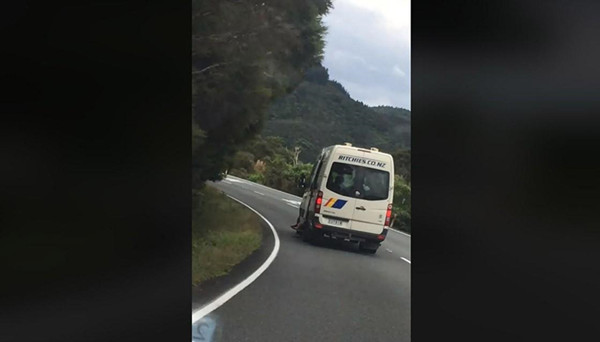 周四下午,Danielle Silich驾车行驶在Mangamuka以南约10公里的1号高速上,她发现前方有一辆Ritchies Coachline面包车,车门居然是打开的,里面还有女孩子将双腿伸出门外。