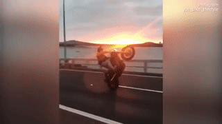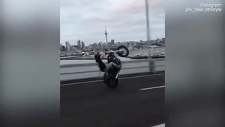 这条在网上流传的视频记录了新西兰奥克兰市一男子在骑摩托车通过奥克兰海港大桥时全程前轮离地的特技。该视频在发布后得到大量观看和转载,引起热议。