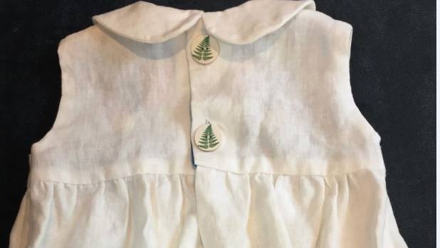 国礼哈衣造型复古,有彼得潘领,扣子上有银蕨图案 Pene Gayford