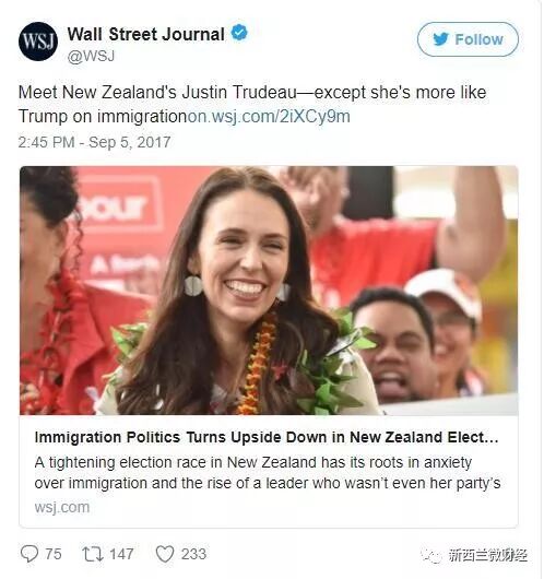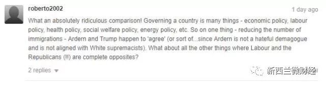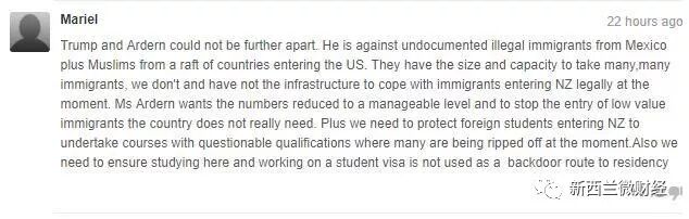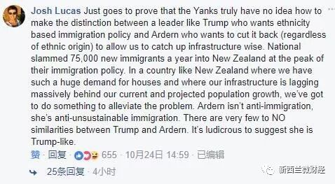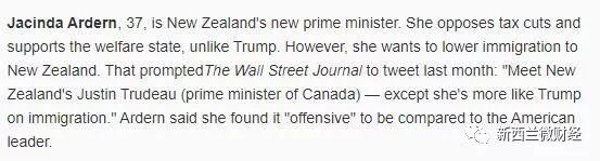 这个比较是USA Today最先做出的。 在这篇叫做“美国总统的男人和女人们:川普式领导人全档案”的文章认为,现在国际上已经有了一种“川普效应”,世界各国都有川普式的政客出现,而且都得了大量的支持。   何为“川普式”? 文章认为,川普式的政客身上都多少具备川普的特色:有钱、有争议、直言不讳,懂得挑动“本土主义者”们在移民、伊斯兰、贸易、就业以及法律秩序等问题上的情绪,从而为自己铺平竞选道路。   而这篇外媒报道说,新西兰新任女总理Jacinda Ardern则与法国极右翼政党领导人Marine Le Pen、英国外交部长Boris Johnson,极有希望成为下届捷克领导人的Andrej Babis,菲律宾总统Rodrigo Duterte、保加利亚反移民政党领袖Vaselin Mareshki等政客的名字一起,被列在了该文章的“川普式领导人”名单之上:  同名单中的菲律宾总统Rodrigo Duterte,曾扬言要烧掉联合国,并拿自己和希特勒做比较  同名单中的Marine Le Pen是法国极右翼势力分子,强调要国家要走“法国人永远第一位”的核心路线。  同名单中的Boris Johnson,现任外交部长,英国脱欧的坚定支持者,其外形也经常被拿来和川普做比较。 而对于Jacinda Ardern,这篇文章是这样介绍的:  Jacinda Ardern,37岁,是新西兰的新总理。她反对减税,支持福利,这和川普不一样。但是,她却希望减少新西兰的移民。难怪上个月华尔街日报这样发了这样一条推特:“来见过新西兰的Justin Trudeau(加拿大的年轻总理),不过在移民问题上,她更像川普哦~”。不过Ardern却表示,自己被拿来和美国领导做比较,让她感觉“被冒犯”。  上月新西兰大选期间华尔街日报发的推特 Jacinda对此回应:感觉受冒犯   美国媒体的这篇文章一出,也立刻迎来了新西兰方面的高度关注。 先是NZ Herald和Stuff等当地主流英文媒体先后转发文章或报道了此事,接而又引起了新西兰网友的大量讨论。  从网友对报道的留言来看,绝大多数的新西兰网友,对美国媒体的这种比较,都表示了不!认!同!  “阿登不是反移民。她只是希望减少数量。国家党很喜欢大量移民,因为对于国家党有钱的生意伙伴们来说,移民是维系低工资成本的工具。”  “美国佬根本就不知道如何去把推行种族划分式移民政策的川普式领导和阿登区分开来——阿登要的是无论种族来源,对移民实行一律减少,为的是要让我们在基建方面跟上。 “在国家党的移民政策下,新西兰一年涌进了高达75000人的新移民,在像新西兰这样住房短缺、基建根本无法跟上人口增长速度,严重拖后腿的国家,我们必须要做点什么,来缓和现在的矛盾。  “阿登不是反移民,她是反对不可持续发展式的移民。川普和阿登之间的相似点几乎为零,说她是川普式,简直让人笑掉大牙。”  大选期间的阿登  “她在移民上的立场,是对这个国家过去四年来广大民意的回应,如果国家党听一听公民的心声,而不是一味通过以扰乱Kiwi日常生活为代价,大量引进移民的方式,来让我们国家的经济看似欣欣向荣的话,或许他们下次也会再次掌权。”  “我极其支持移民,我并不认为你出生在哪里,你就应该一辈子在那里生活。不过,我同意我们需要慢下来。很明显我们现在基础建设是匮乏的,住房是不够的,这意味着我们生活不安定。让我们回到已有居民和新居民都能够享受好的生活质量的状态下,然后再慢慢提高(移民)数量吧!”  “这比较太奇怪了,除了她减少移民以外……她是左翼的啊!去年在奥克兰她甚至参加了反对川普的抗议活动。 ”          阿登去年曾参加了奥克兰反川普歧视女性的游行  “”川普和阿登差得不能再远了。川普是反对墨西哥以及偷渡到美国来的穆斯林非法移民。他们国家有那么大,也有能够接受足够多的移民, “我们没有,我们现在的基建,连维系每年合法增长的移民都困难。阿登女士想要的是让移民数量回到一个能有效管理的水平,拒绝掉那些我们国家不需要的低技能移民。  “而且,我们也需要保障进入新西兰学习的外国学生们上的不是没质量的课程,避免他们像现在这样,大多都是被骗过来榨钱的。而且,我们也要保障拿着学签来这里学习和工作的人不是把这个当做移民的后门在走。”  目前工党官网贴出的关于对减少移民的政策与大选前公布的并无变化。 其中,学生签证类计划削减低等级学生签证发放量,预期结果:减少6000-1万; 而对毕业生的Open工签也将进行限制,低学历或没有工作邀请的毕业生将不再能获得1年的开放工签,预期结果:减少9000-1.2万  “Jacinda我不同意你的政策我也没有投票给你,但被拿来跟川普那些人比较,你的确有一万个理由觉得备受侮辱。  “美国,管好你们自己的川普问题吧,内是你们自己选出来的怪物。为剩下的世界做件好事,把他关在家里,在你们投票把他选下去之前,让他闭上臭嘴别在外滋事。幸运的是,你们现在还生活在民zhu里,还能够这么做。”   今年2月在伦敦发生的反川普游行 “这比较太荒唐了!执政是很多事的综合——经济政策、劳动政策、健康、社会福利、能源等等等等。所以,即便只是在移民数量这一个问题上,阿登和川普都貌似“同意”减少(但阿登并不是川普那样的仇恨煽动家,名字也没有和白人至上者联系在一起),那在其他的问题上呢?在那些工党和美国共和党完全持相反立场的问题上呢?”   阿登曾明确表示认为应该对女性堕胎进行除罪化   在大量的