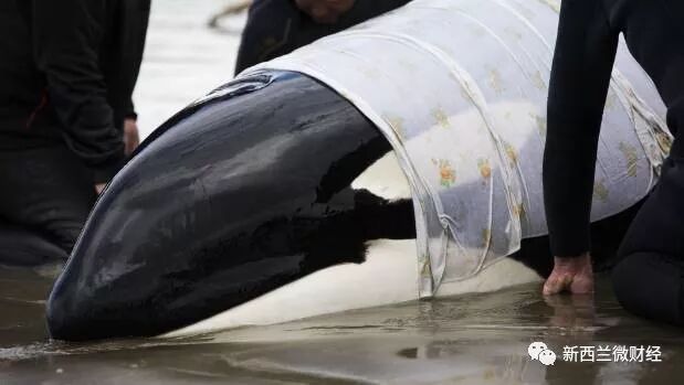 11月的一天, 南岛Marlborough的Marfells海滩 一头年轻的虎鲸不幸搁浅 引来众多居民许多居民带着铲子水桶, 帮助虎鲸重返大海。