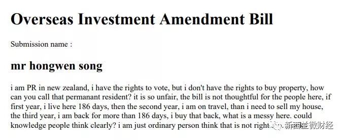 署名Hongwen Song的提交人提醒政策制定者注意一个矛盾:他刚刚有了新西兰的投票权,但是根据新法,他却不能买房。