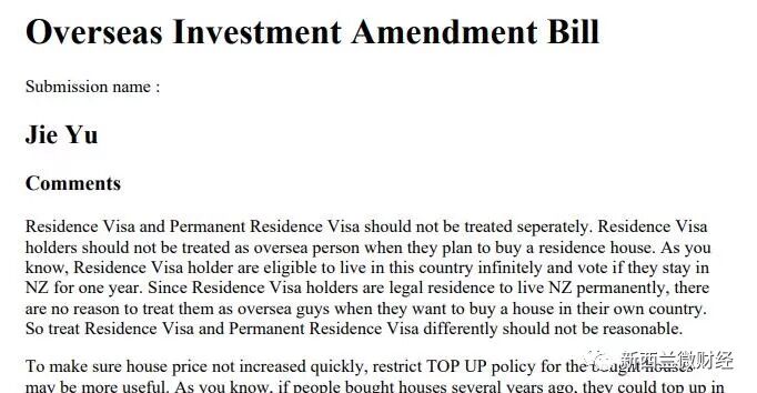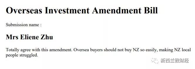 署名Eliene Zhu的提交者说,“完全同意修法,海外买家不应该如此容易地购买新西兰,让新西兰本地人生活艰难。”