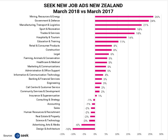 Seek显示,在奥克兰招聘量下滑最严重的行业有会计、房地产、设计和建筑、市场以及销售行业。不过制造业、贸易以及旅游服务行业的招聘需求依然很大。