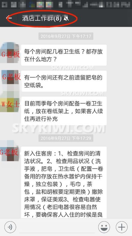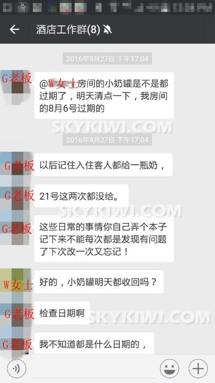 爆料者还向天维网记者展示了管女士组织的一个微信的“酒店工作群”中的聊天记录,