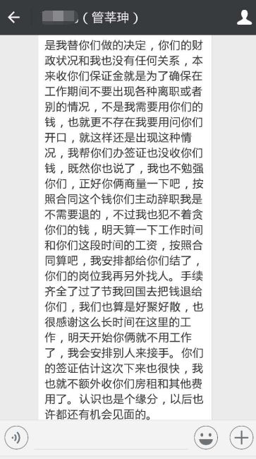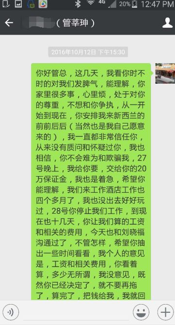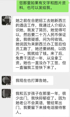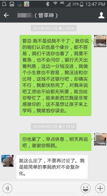 直到M师傅在2016年10月因为旅游签证到期离开新西兰,他都没有拿到此前许诺的工作签证。回国后,M师傅几次向管女士提出要求返还当初承诺返还的20万人民币,以及半年的工资。都被管女士用各种托词拒绝,甚至对他表示,让M师傅来工作导致自己损失惨重,让M师傅不要再讨要这笔钱。