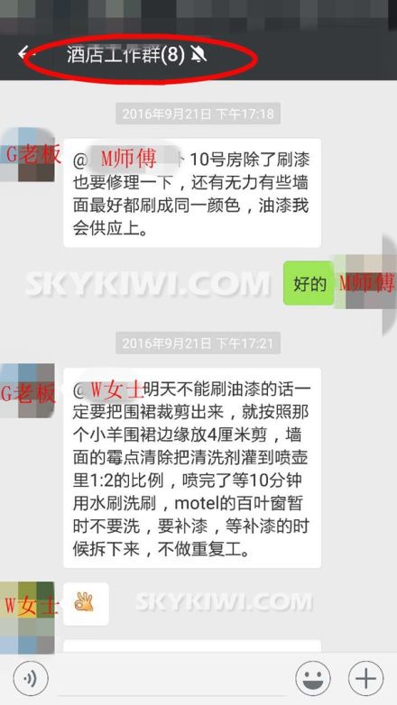 在这个群中,管女士每天给群里的包括M师傅和W女士在内的几位华人员工布置工作,每天工作结束后,每个人还需要在群里发照片,管女士作为雇主还会对几个人的工作质量好坏进行点评。