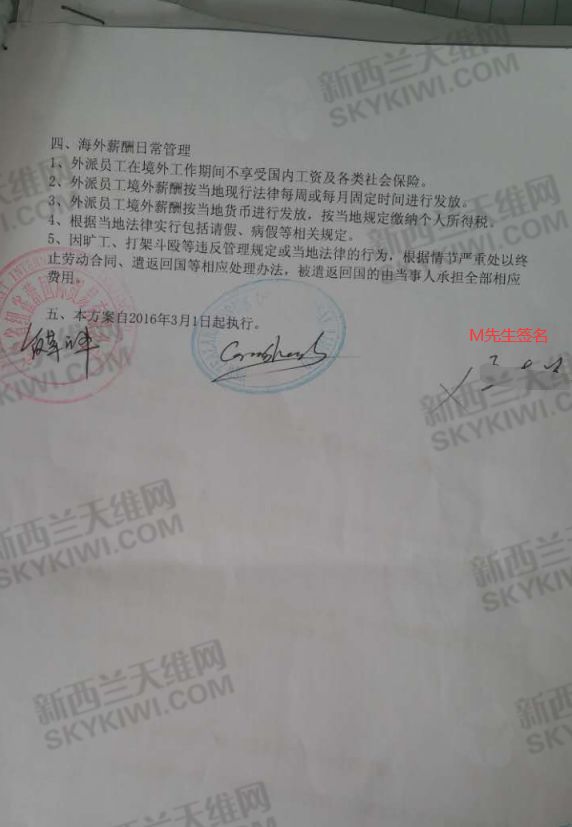 除此之外,为了满足办理新西兰工作签证的要求,M师傅还在管莘珅经营的国内公司交了半年社保。双方于2016年3月正式签署了中英文的工作合同。M师傅向管莘珅转账了20万人民币。