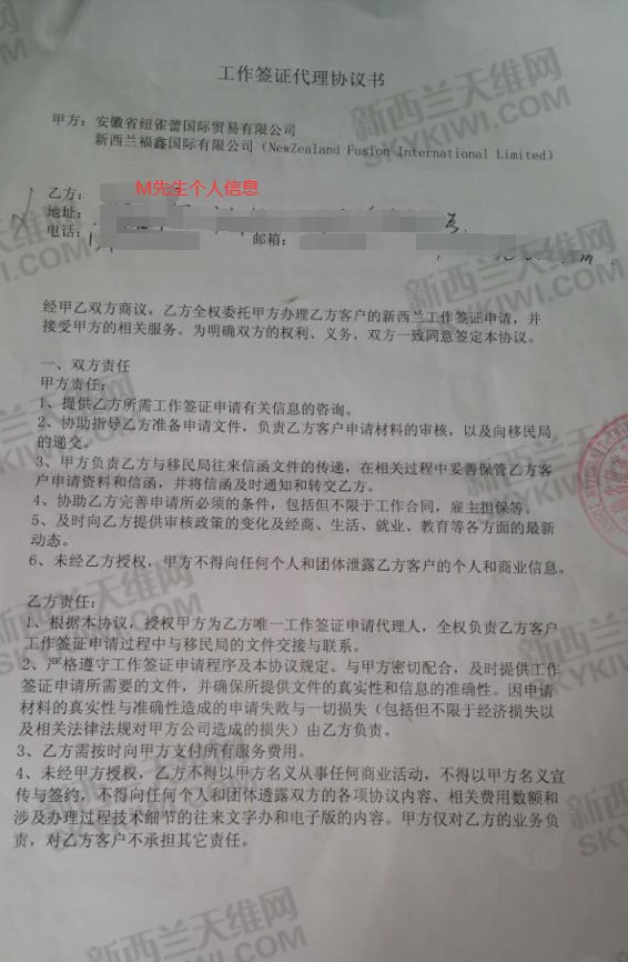 于是他联系了这位招工的雇主管莘珅(英文报道中名为Shenshen Guan)女士。M师傅了解到,这份工作的工资和工作条件“会符合新西兰的标准”,会给M师傅办理工作签证,并且“明示暗示将来可以帮忙办身份”。