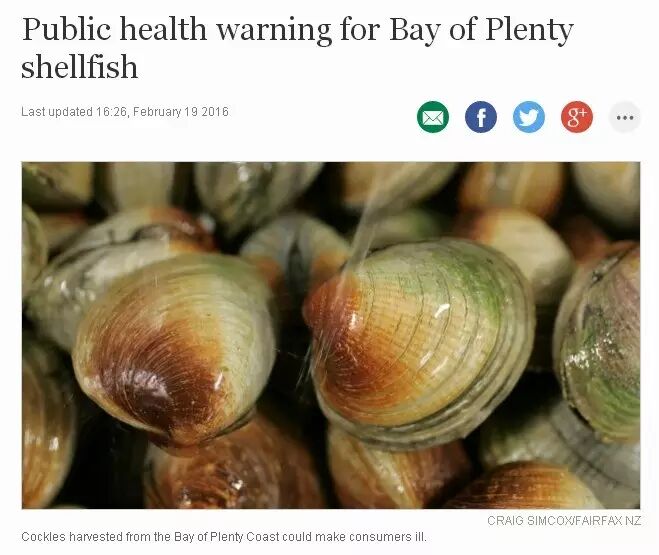 初级产业部(MPI)2月19日正式发文,建议人们不要使用该地区从Otahu River河口到Whakatane Heads之间的近海贝类,及包括Tauranga Harbour, Maketu 和Waihi河口,Matakana和Motiti岛及周边岛屿。