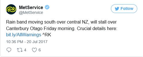 “在接下来的3个小时内,坎特伯雷南部地区到奥塔哥北部地区都会经历大暴雨,降雨量将会达到40-50毫米,”Marsters表示,“周五晚些时候,降雨量可能达到每小时20mm。”