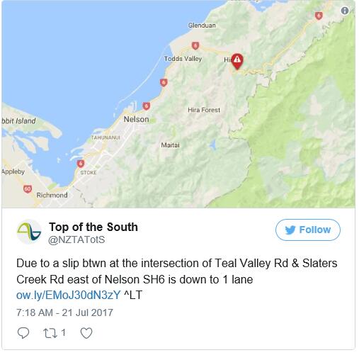 SH6公路受到降雨影响,周六早间6点40分左右,在Havelock和Nelson之间出现一处滑坡,导致期间4公里路段有一条车道受阻封闭。