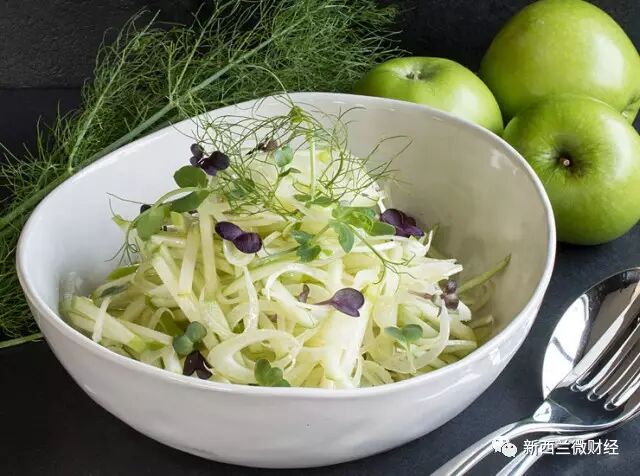 将fennel切丝,注意最外面那层如果有点品相不好就舍掉;青色的苹果切丝,拌上橄榄油、香醋(balsamic vinegar)或者柠檬汁、一点点肉桂粉(cinnamon)和盐调味,这样的沙拉看起来就很健康。