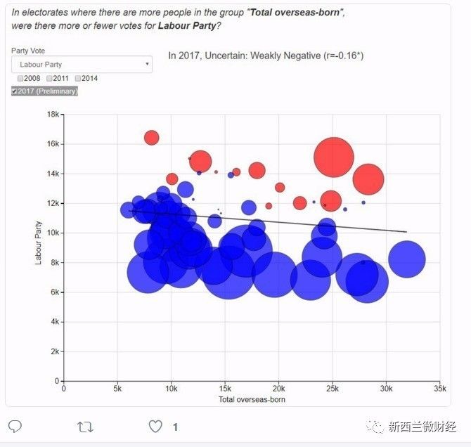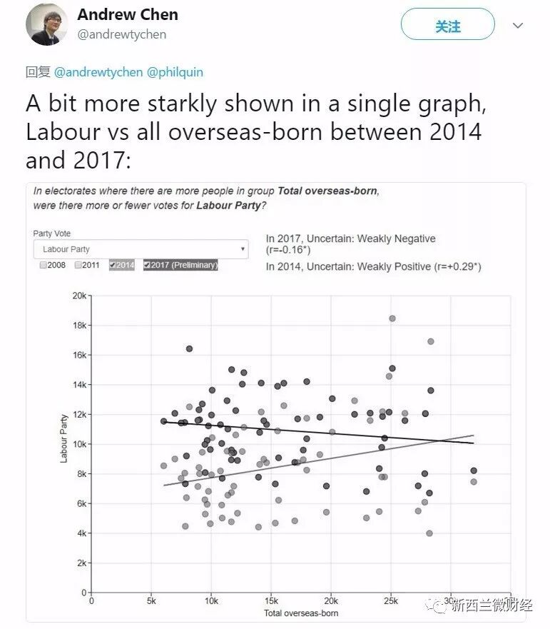 其中一篇推文中,新西兰本地的技术流做了一个图,“工党VS所有海外出生的人2014-2017”:统计了在海外出生人口多的选区中,工党的表现变化。两条趋势线分别代表2014和2017,其中深色线是2017年的。