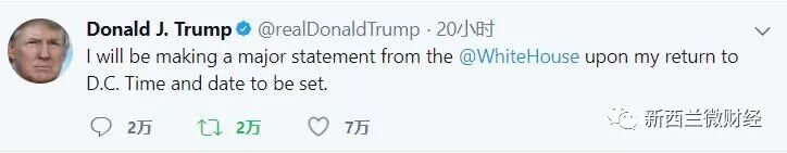另外川普总统的一个推特也引发了更多猜想。川普在登机回美国前称,回到华盛顿之后即将有重大公布。