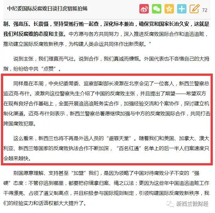 据中纪委官网,中央纪委常委、监察部副部长凌激会见新西兰警察总监Mike Bush时说,“中方愿与各方共同努力,深入推进反腐败国际合作和追逃追赃,推动建立国际反腐败新秩序,为构建人类命运共同体作出新贡献。”