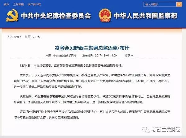 新西兰警察总长到访中纪委,并表示将“继续加强与中方的反腐败国际合作”。