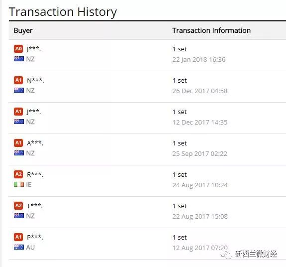 交易记录显示,除了新西兰买家购买之外,美国、爱尔兰、澳大利亚也有买家购买。