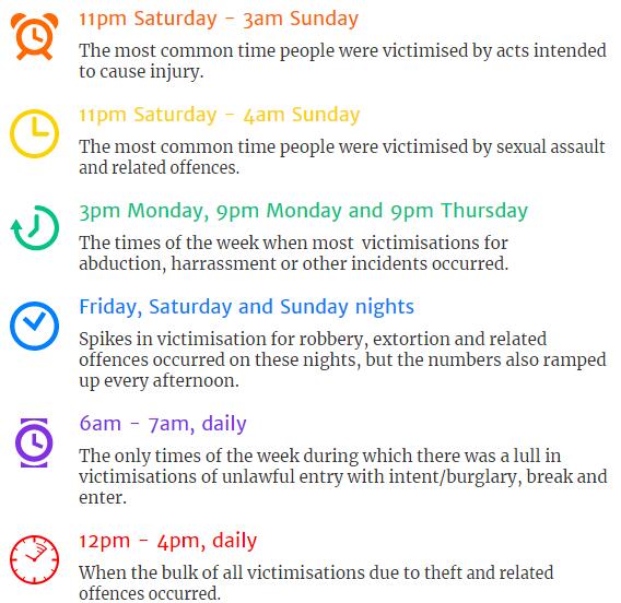 Gavin表示,不同犯罪类型发生的时间有很大不同,比如说在惠灵顿,犯罪率最高的地区是在市中心,时间为周五和周六午夜,这个时间正是人们周末买醉的时刻,通常在周末午夜的时候发生造成人身伤害和性侵犯等犯罪。