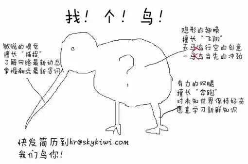 “我们是新西兰最大用户最多的门户网站,纽国版新浪有木有!这个华丽丽的动物园是闹哪样!眼力大比拼是不是!还有那个红色的人字是什么鬼,和别的画风根本不一样好嘛!不过话说回来,基本需求是对的,不过我们找的不是普通人,是有梦想有创意的人,就像skykiwi的名字一样,是一只可以在天空中翱翔的小鸟!”