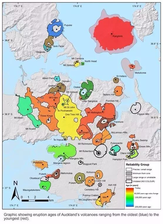 奥克兰火山地图上一共包含53个火山喷发口,每个喷发的量都较小,中间相隔的时间也较长。