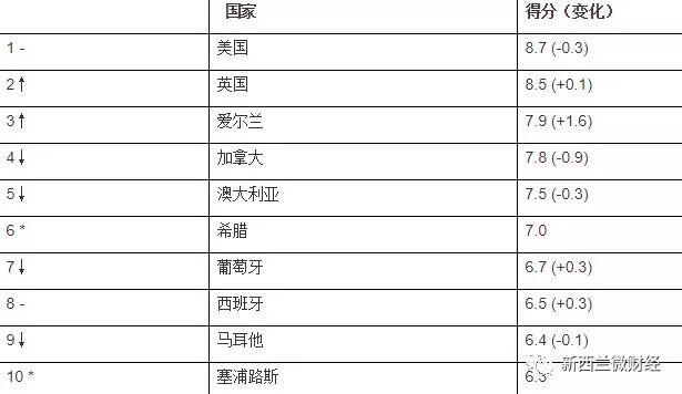 而上升最明显的是爱尔兰和希腊。爱尔兰凭借优质的教育体系,和低至12.5%的企业税成为此次移民黑马,今年移民指数得分仅次于美国和英国。