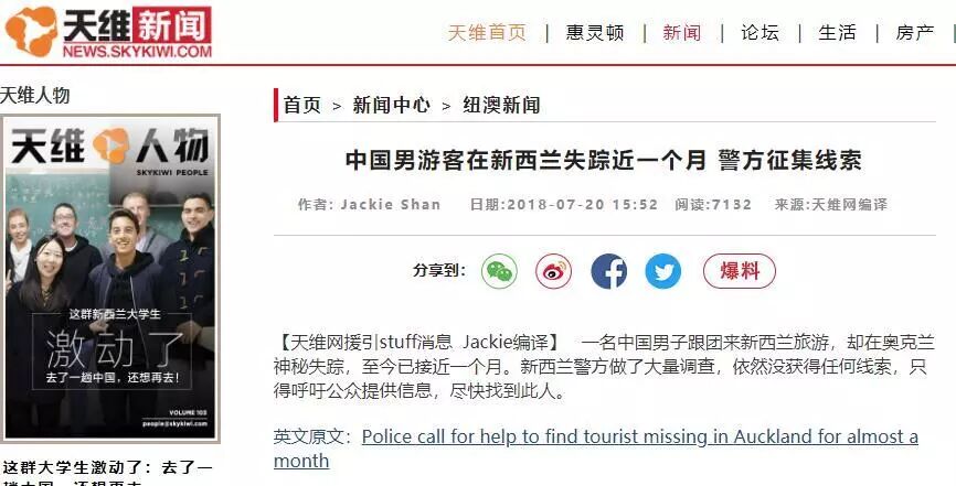 在张彪失踪一个月后,新西兰警方向公众寻求有关信息。