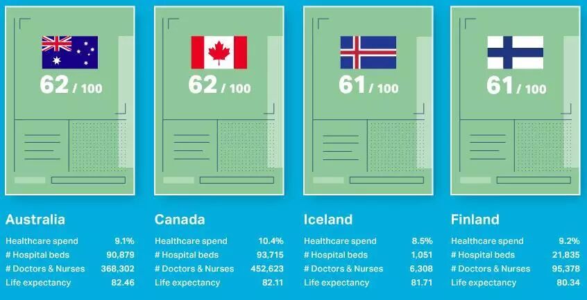 这项榜单从医疗占GDP比例,病床数,医生护士人数,人均寿命4个方面,以满分100分,来对各个国家的情况进行打分,
