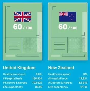 新西兰的总分为60分。健康医疗占GDP的9%,人均寿命为81.45岁,拥有12821张病床,62843名医生和护士;
