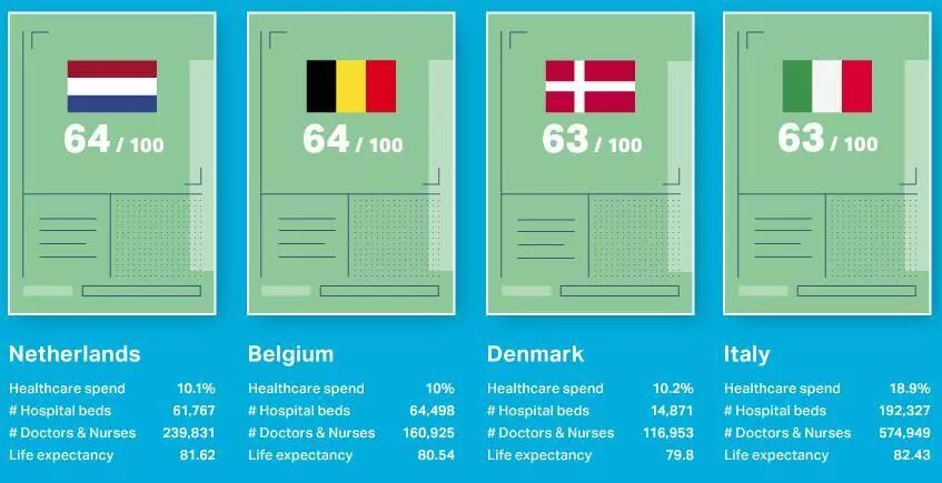 意大利是所有入榜国家中,在医疗上指出比例最大的,占到了GDP的18.9%,但总分只有63,排在第12位。