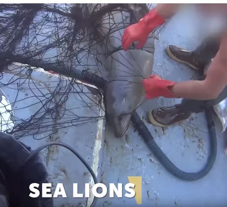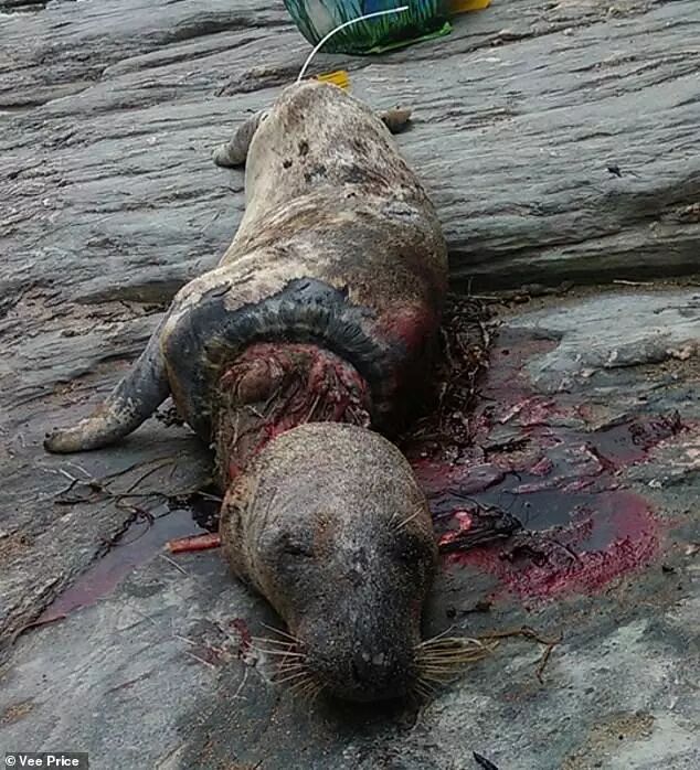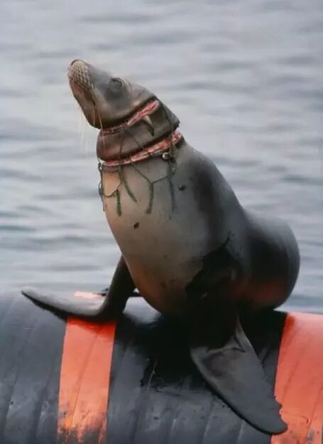 下图这只海狮被发现时,身上就缠着35公斤重的渔网,脖子已经被残忍地勒断了