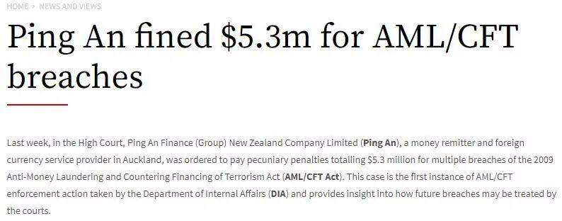 2017年,因违反“反洗钱法”相关规定,平安金融集团新西兰有限公司(Ping An Finance Group New Zealand Company Ltd)被罚了529万纽币;