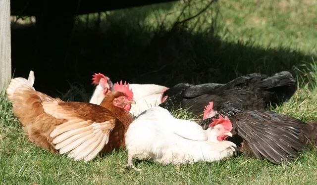 接下来,记者在附近晃悠的时候,又看到5只鸡在懒懒地晒太阳。