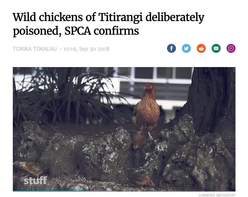 去年有新闻报道,发现Titirangi的名鸡们可能被下了毒,有些鸡走路摇摇晃晃,口吐白沫。