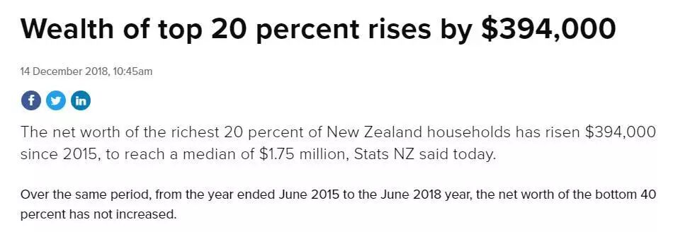 而根据新西兰统计局的数据,自从2015年6月到2018年6月的3年来,新西兰最富的那20%家庭的资产净值中位数,平均增长了39.4万纽币,达到了175万纽币。