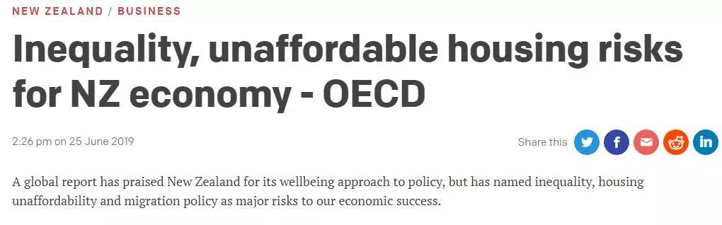 今年6月,经合组织发布的一项全球报告也明确指出,新西兰虽然在经济增长上呈现出稳定繁荣的一面,但其社会不平等,住房的不可负担问题以及移民政策,都成为了对新西兰经济产生威胁的因素。