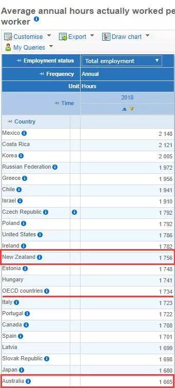 而新西兰惊恐地发现,在经合组织国家“国民平均工作时长”的统计中,新西兰人竟然以一年1756小时,排在了经合组织国家平均水平之上……