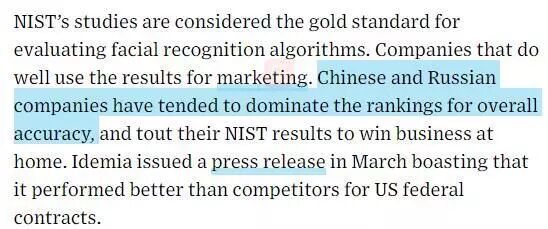 “在(识别人脸的)整体准确率上,中国和俄罗斯的公司占据了排行榜的前列。”