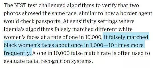 而为美国边境提供面部识别技术服务的法国公司Idemia日前也被爆出,其最新的系统,辨识黑人女性的错误率,明显比辨识白人的错误率要高1000倍。