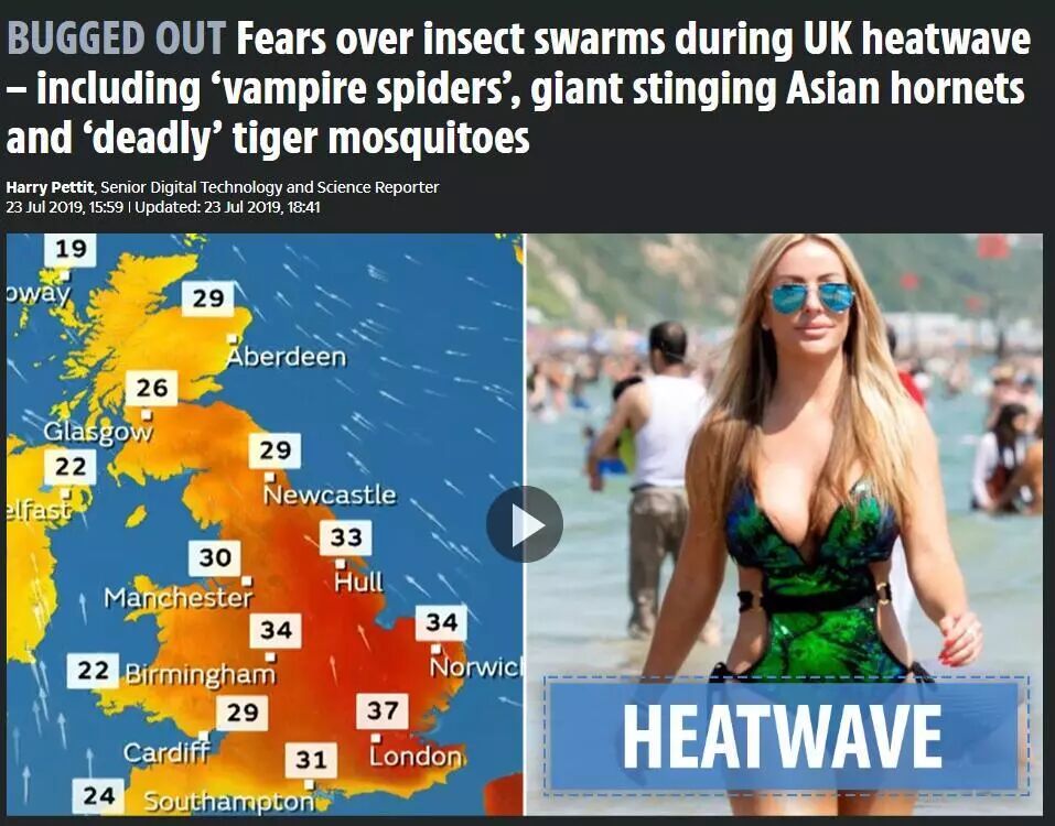 随着英国很多地区本周的气温都达到了36摄氏度以上,一大堆危险甚至致命的虫虫,也躁动起来了。