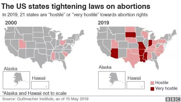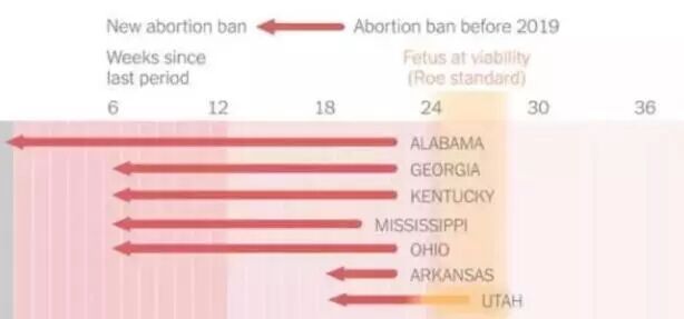 实际上,现在全美有近30个州都在立法中引入了某种形式的堕胎禁令,其中,7个州都大幅度缩小合法堕胎的时间。