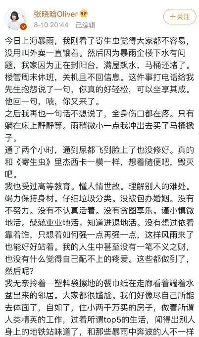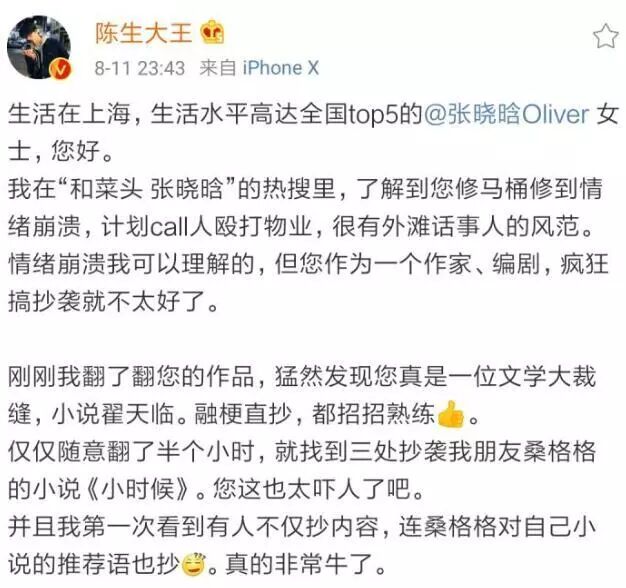 张晓晗感到很糟心,于是她发了微博长文对整件事进行了吐槽。