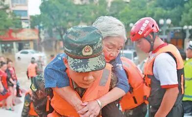 市政人员脱下手套清理排水沟的树叶;预备役官兵背着百岁老人转移;电力抢修人员夜以继日……