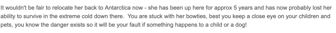 “送回南极圈很不公平啊——她已经离开了5年多,可能已经失去了在南极生存的能力。船友们还是忍忍吧。另外,大家要自己看好孩子和宠物……”