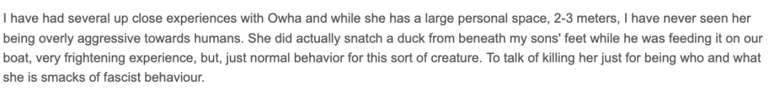 我跟Owha近距离接触过好几次,大概离她两三米远吧。我从没看到她对人起敌意。但有一次我儿子在喂一只鸭子,Owha过来一口就吞下去了,看起来是挺可怕的。但是这不过是动物正常捕食而已。要是因为她的本性就杀了她,才真是法西斯作风。