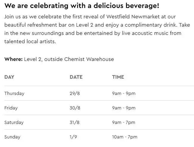 从今天开始,一直持续到周日的整个周末,Westfield Newmarket内将免费供应特调(无酒精)鸡尾酒。