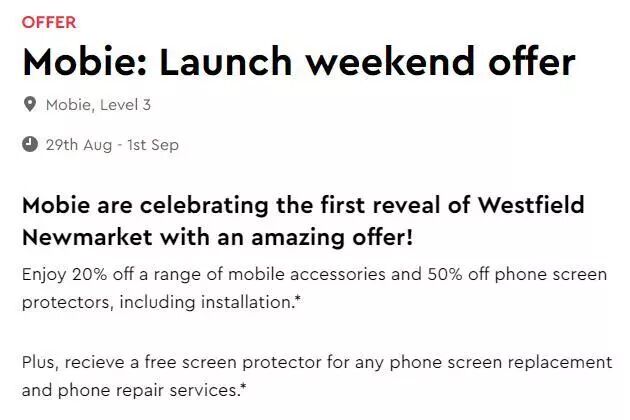 位于Mall三楼的Mobie在周末期间,实行部分手机配件8折优惠,其所售屏保则享受5折优惠,还负责免费安装,并赠送手机保护壳和修手机服务。