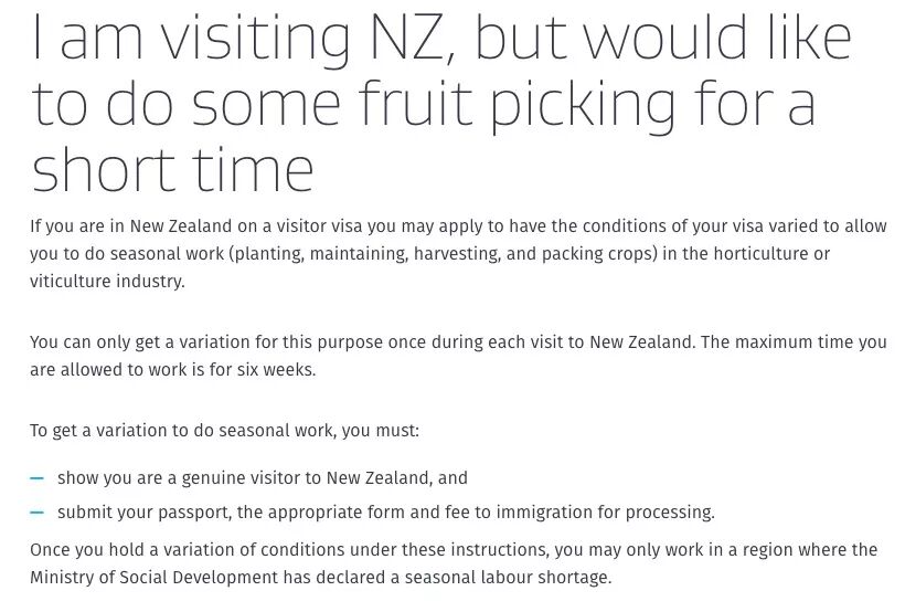 如果只持有旅游签证,也可以申请去果园工作,但必须要恰逢当地宣布季节工短缺,一般来说,在这种情况下,可以跟移民局申请更换签证,申请费为170纽币,一般可工作6周左右。