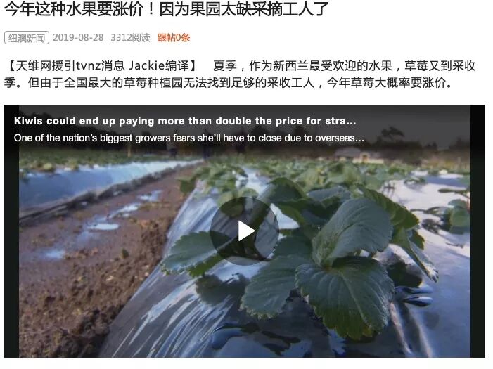 比如最近新西兰的草莓采摘季快到了,但是吧,目前人工缺口很大,估计有大量草莓要烂在土里了,这个时候季节工就是种植园主的大救星了。
